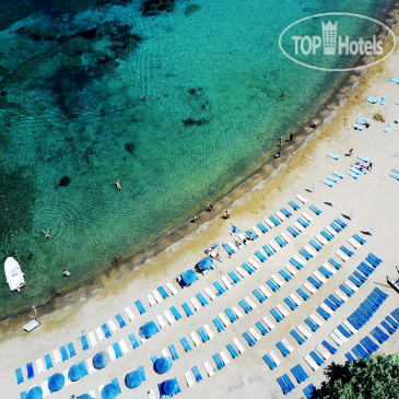 Пляж находится совсем рядом, море чистое, песок, видимо насыпной, потому что остальное побережье каменистое. На пляже много лежаков, в это время года было довольно свободно.
